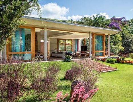 Portas grandes e pé direito alto, esses dois ingredientes, fazem a conexão da casa com o entorno. Uma casa de campo já traz com ela todo aquele clima de lugar mais isolado onde você pode ler, conversar e aproveitar um tempo reunido com quem você gosta.