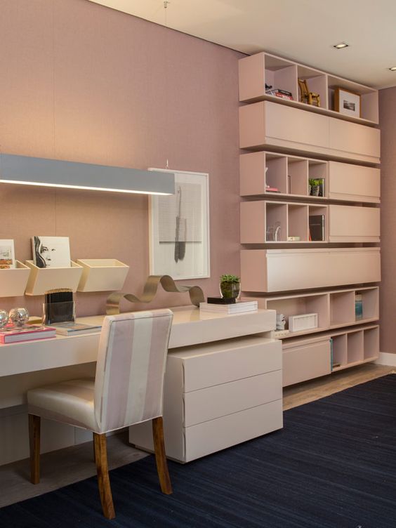 Já na decoração, ele está muito presente, e pode aparecer em vários momentos. O rosa clarinho para um escritório, é uma boa alternativa para quem quer colocar mais cor dentro do ambiente sem fugir da base branca.