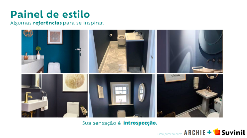 Apostamos no tom azul-marinho da Suvinil para todas as paredes do lavabo, um tom introspectivo, para trazer elegância ao ambiente e torna-lo convidativo. Como a cliente possui entrada de luz natural, pudemos apostar em um tom escuro sem maiores problemas.
