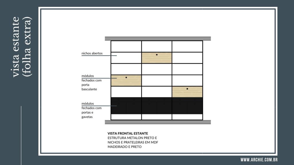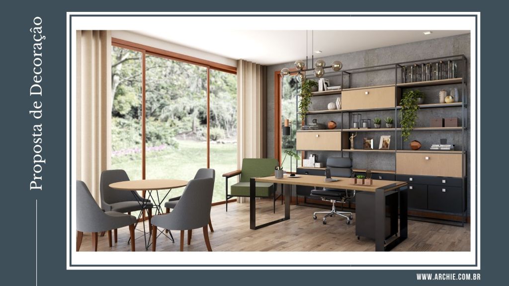 Fábio, nosso cliente, queria para este ambiente uma pegada mais industrial, e gostaria de ter uma estante para acomodar seus livros e materiais de trabalho. No final, esta estante acabou se transformando na grande estrela do ambiente.