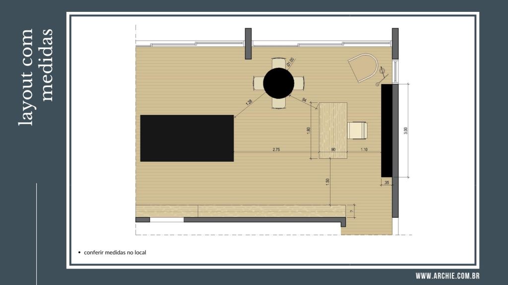 Para reuniões rápidas, que ele eventualmente precisasse fazer, a archie Luiza pensou em utilizar uma mesa redonda, para que quando o espaço fosse utilizado para lazer, pudesse ser uma bela mesa de carteado.