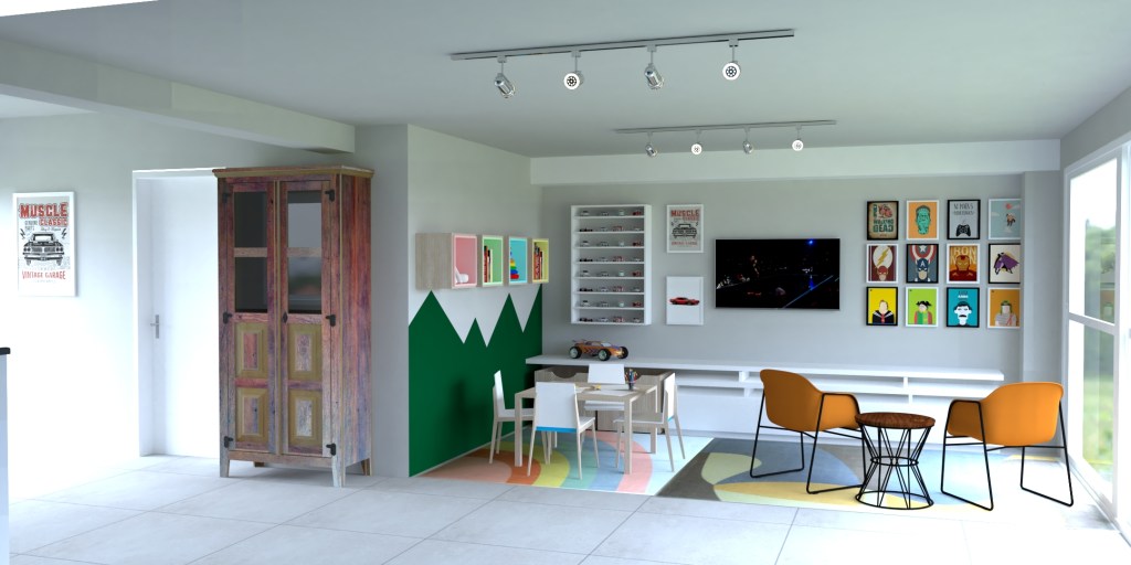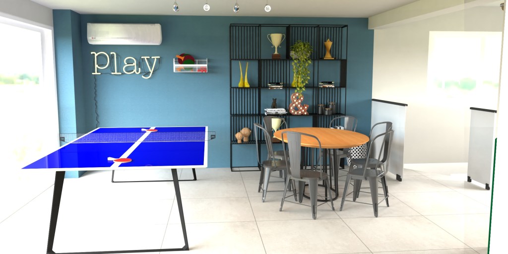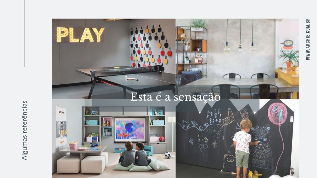 Muita atenção com a setorização do espaço também… levemente demarcado, os jogos para um lado (mesa oval e ping-pong) e brincadeiras e tv para o outro.
