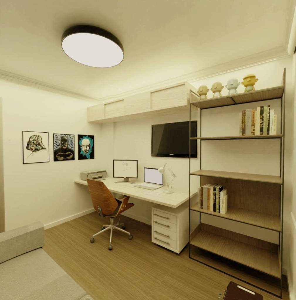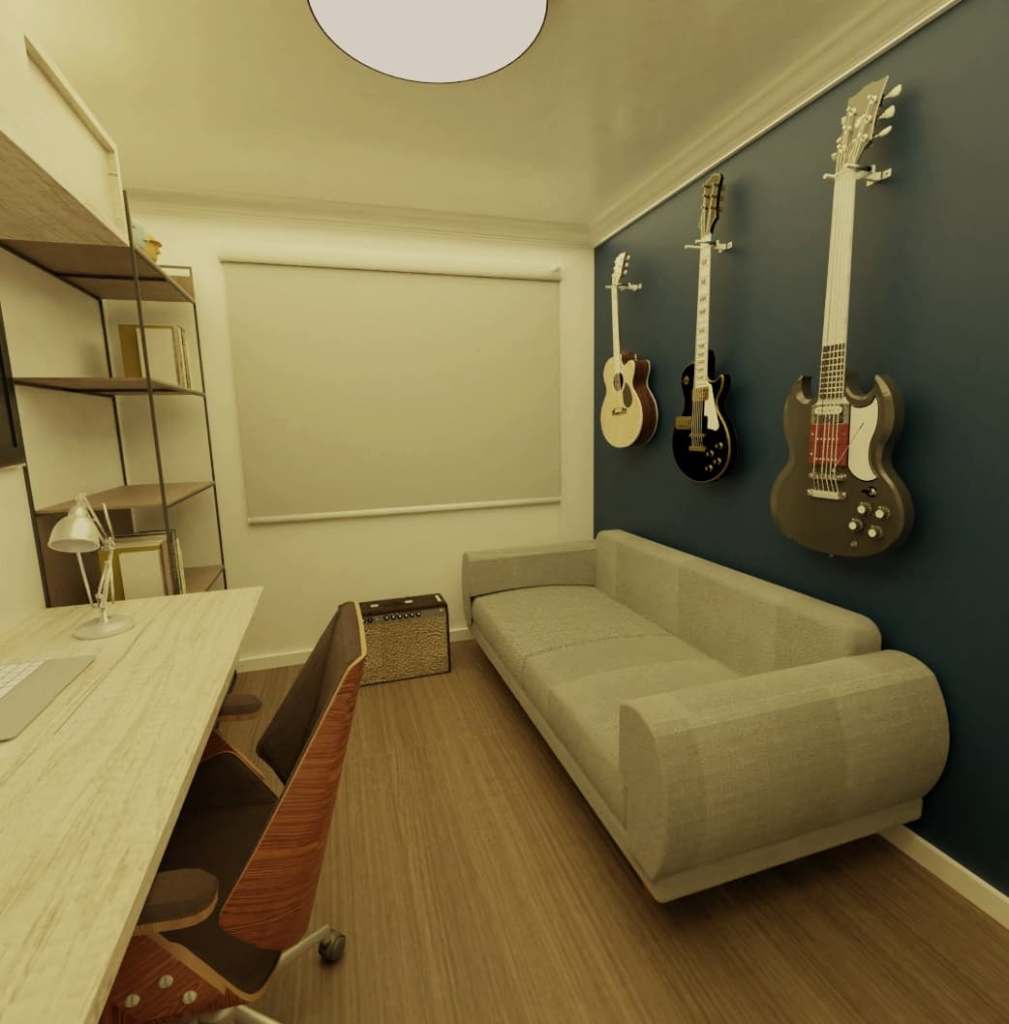 Todo mundo tem vontade de ter aquele espaço em cada dedicado ás paixões! Seja uma cozinha especial para cozinhar pratos elaborados, seja um closet com muito espaço para roupas e um conato especial para maquiagem e cabelo, e seja o caso deste nosso cliente que queria um ambiente para sua música, seus games e, como não existe almoço grátis, seu trabalho também!