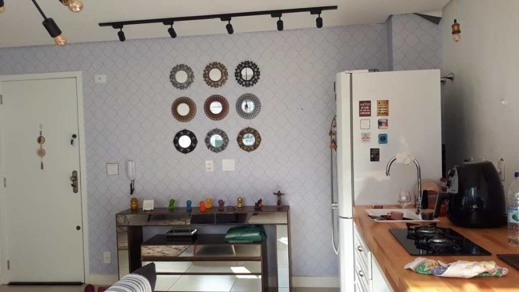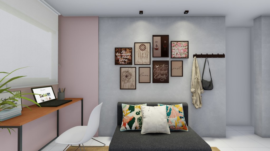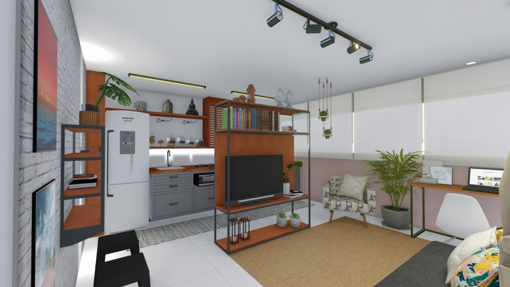 Queria reaproveitar o sofá, o armário da cozinha, quadrinhos decorativos e luminária de trilho. Também solicitou um espaço para trabalhar Home Office.