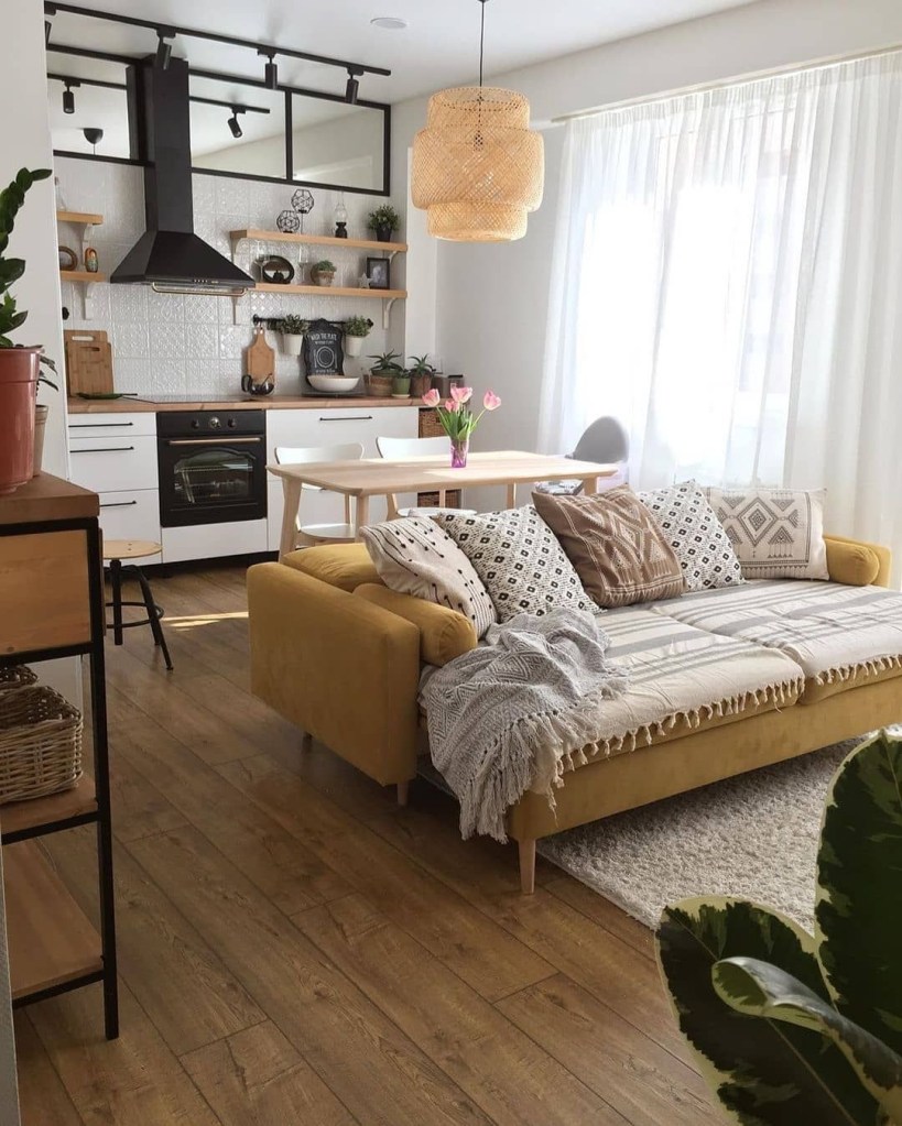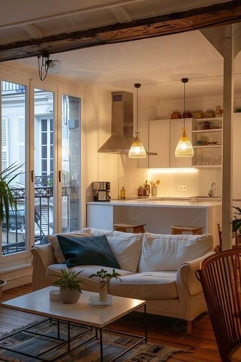 • Objetos decorativos: Almofadas, tapetes e quadros na sala podem conversar com elementos decorativos da cozinha, como vasos, utensílios e até eletrodomésticos.