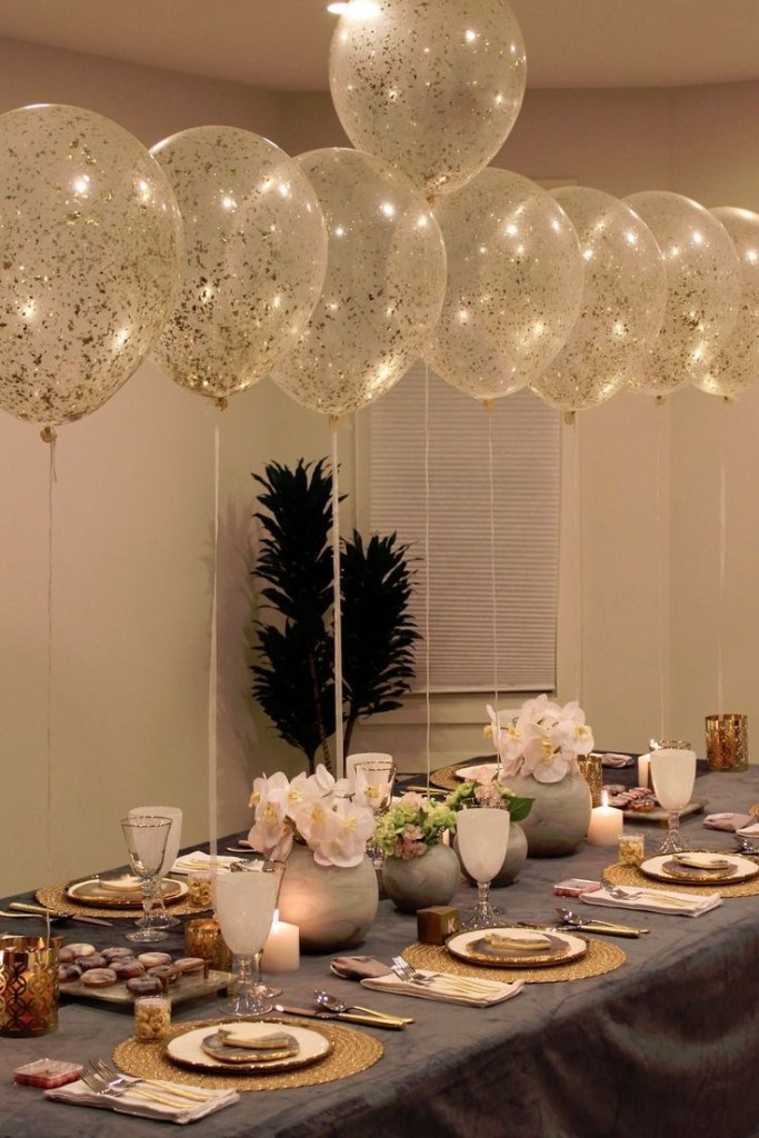 Adicione brilho à decoração de forma sutil, com peças de cristais, espelhos e itens dourados ou prateados. Um centro de mesa com taças de cristal, talheres e pratos sofisticados, ou ainda detalhes em veludo nas almofadas e cortinas, são ótimas opções para garantir que a decoração tenha um toque elegante sem perder a leveza.
