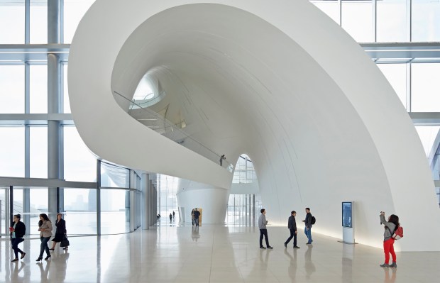 O Heydar Aliyev Center não tem uma divisão clara entre teto, paredes e chão; ao contrário, suas superfícies se dobram e se fundem em um movimento contínuo, criando a sensação de um espaço infinito. Esse conceito reflete a assinatura de Zaha Hadid, conhecida por desafiar as regras tradicionais da arquitetura com suas formas orgânicas e dinâmicas. A fluidez do design não é apenas visual, mas também funcional, permitindo uma transição natural entre os diferentes ambientes internos.