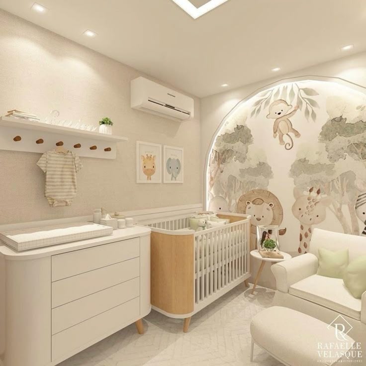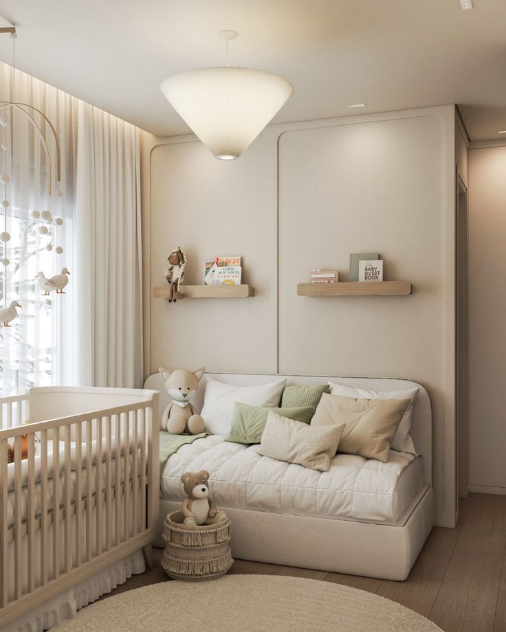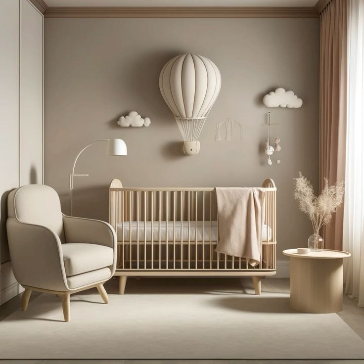 Mesmo em um quarto neutro, é possível adicionar personalidade através de pequenos detalhes. Quadros com ilustrações suaves, móbiles artesanais e luminárias com design lúdico conferem charme e individualidade ao espaço, sem comprometer a neutralidade da decoração.