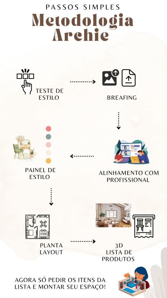 A Metodologia Archie é um processo de atendimento online pensado para agilizar e profissionalizar cada etapa de um projeto de decoração ou arquitetura de interiores. Por ser altamente estruturada e “impessoal”, ela possibilita ao profissional atender diversos clientes simultaneamente, sem comprometer a qualidade do serviço. O grande diferencial é que todas as fases do projeto acontecem de forma padronizada e digital, permitindo que a experiência seja rápida, organizada e escalável.