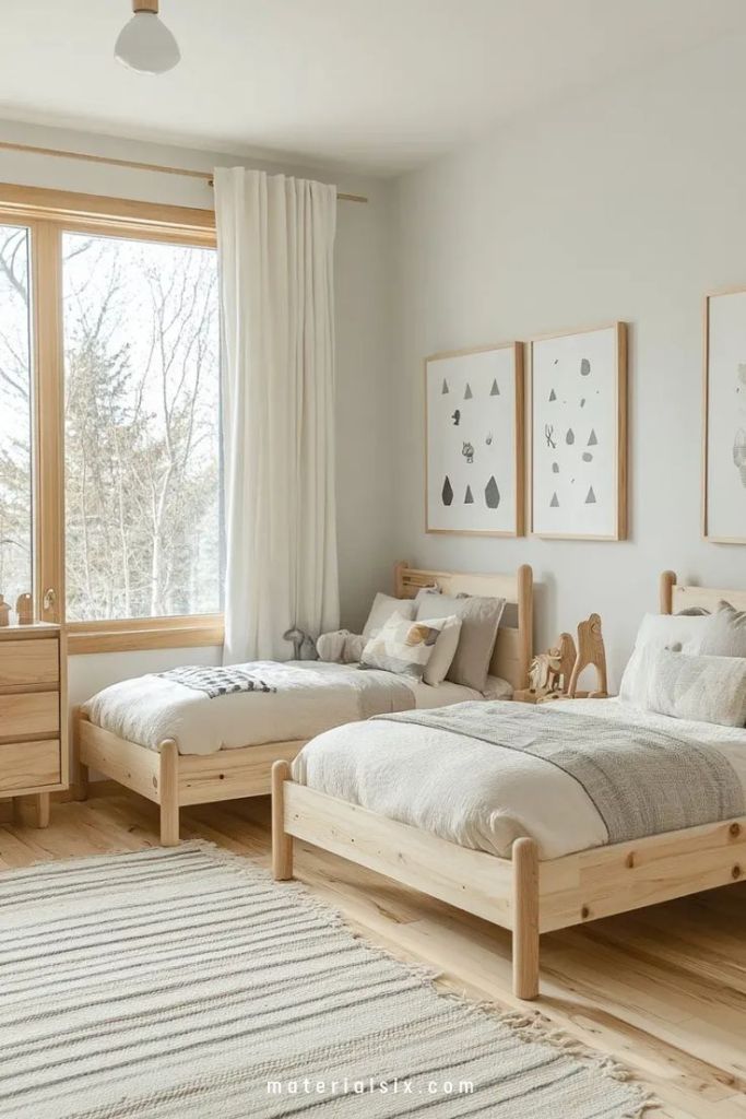 Investir em móveis planejados ou modulares é essencial para otimizar o espaço. Berços ou camas idênticas posicionadas lado a lado promovem equilíbrio e facilitam a rotina dos pais. Adicionar uma cômoda central entre os berços pode servir como trocador e espaço de armazenamento, unificando o ambiente de forma prática e estética.