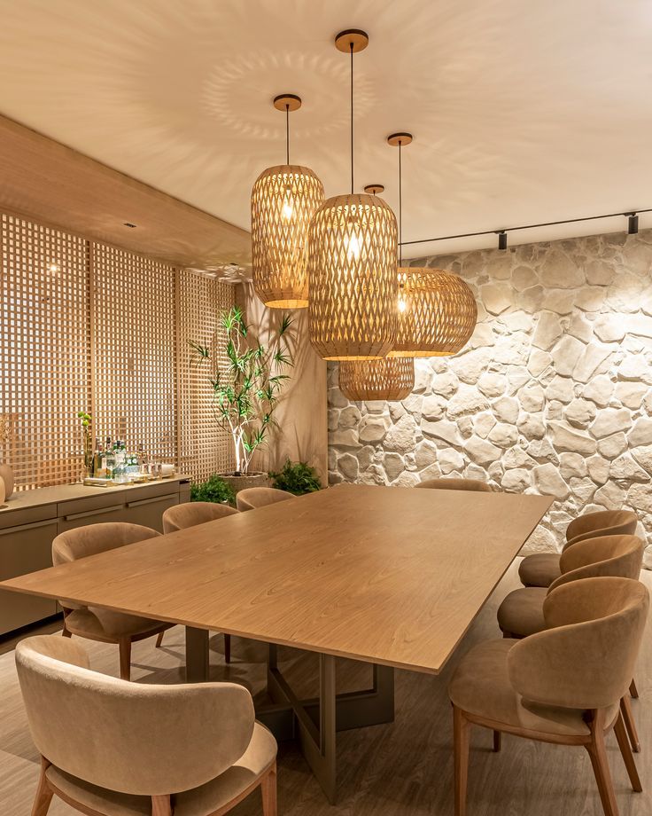Madeira clara, fibras naturais, mármore e detalhes metálicos dourados compõem a mistura ideal. Espelhos ajudam a refletir luz e ampliar o espaço — e o toque glam fica por conta das luminárias esculturais ou de pendentes com design minimalista.