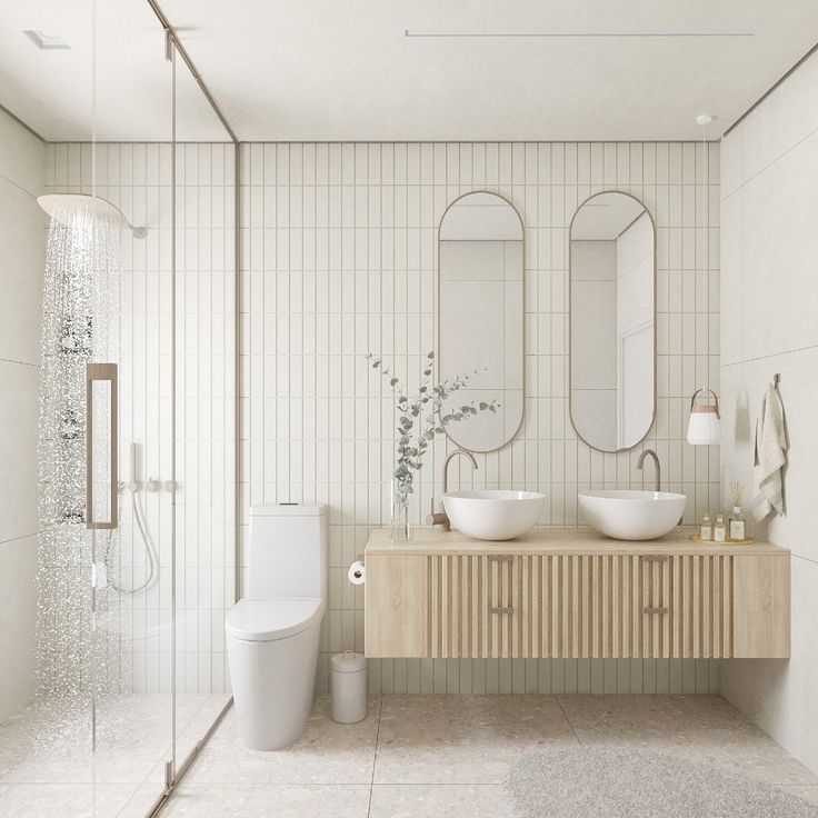 Tons claros como branco, areia, fendi e cinza suave criam a base perfeita para um banheiro elegante e relaxante. Se quiser ousar, acrescente detalhes em preto fosco, dourado ou verde oliva.