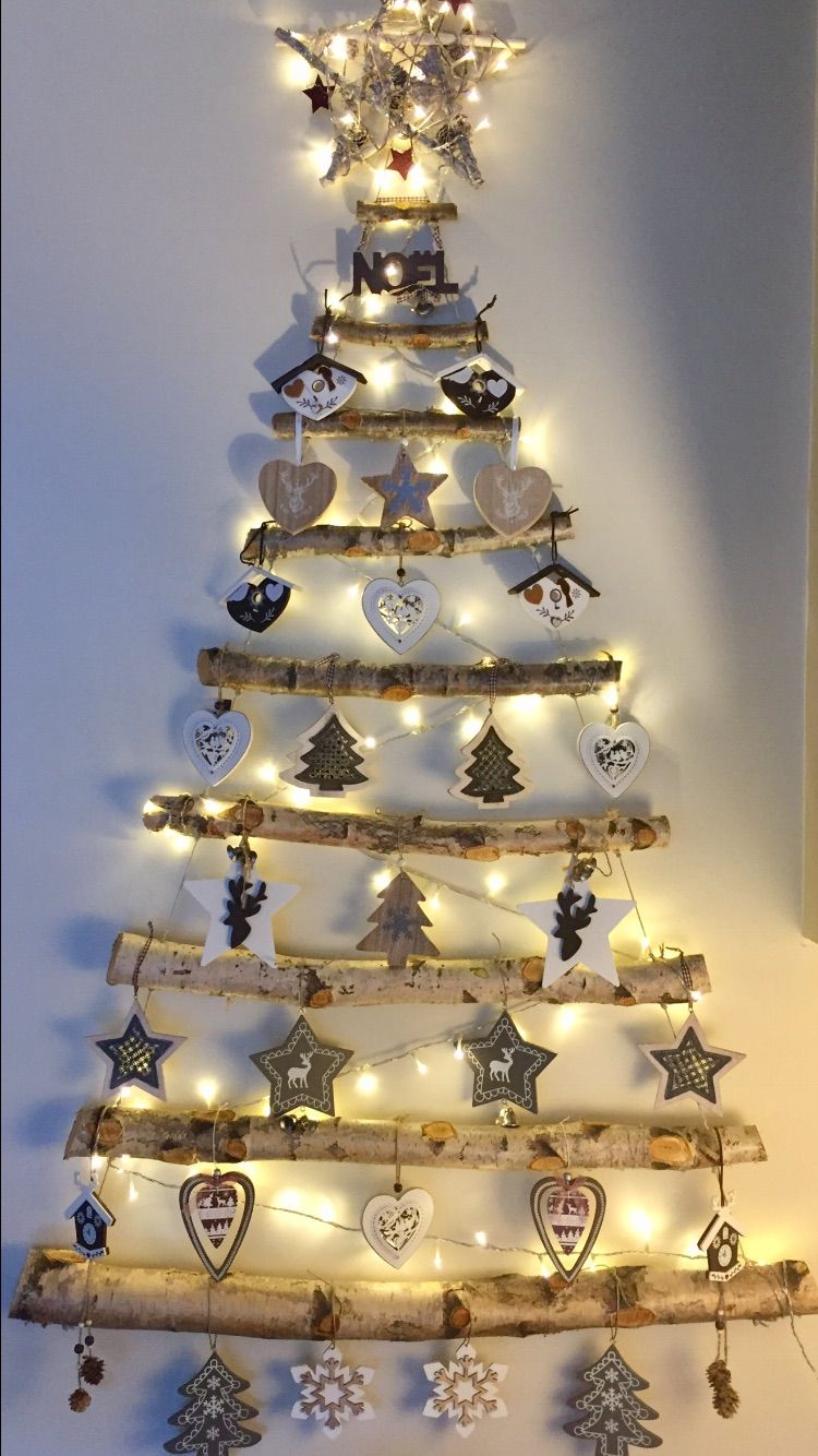 💡 Dica: use galhos de tamanhos diferentes, em formato triangular, fixados na parede com pregos ou fitas adesivas.