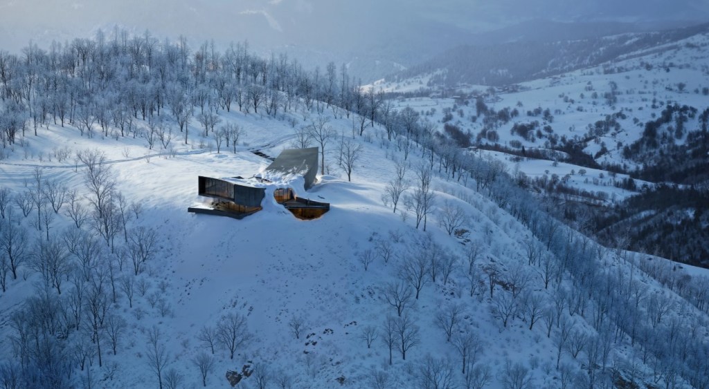 O projeto parte de um gesto único: um volume escuro, monolítico, com cobertura curva que acompanha o desenho natural do relevo e permite que a neve se acumule como parte da estética. Nada é decorativo. Tudo é intencional.
